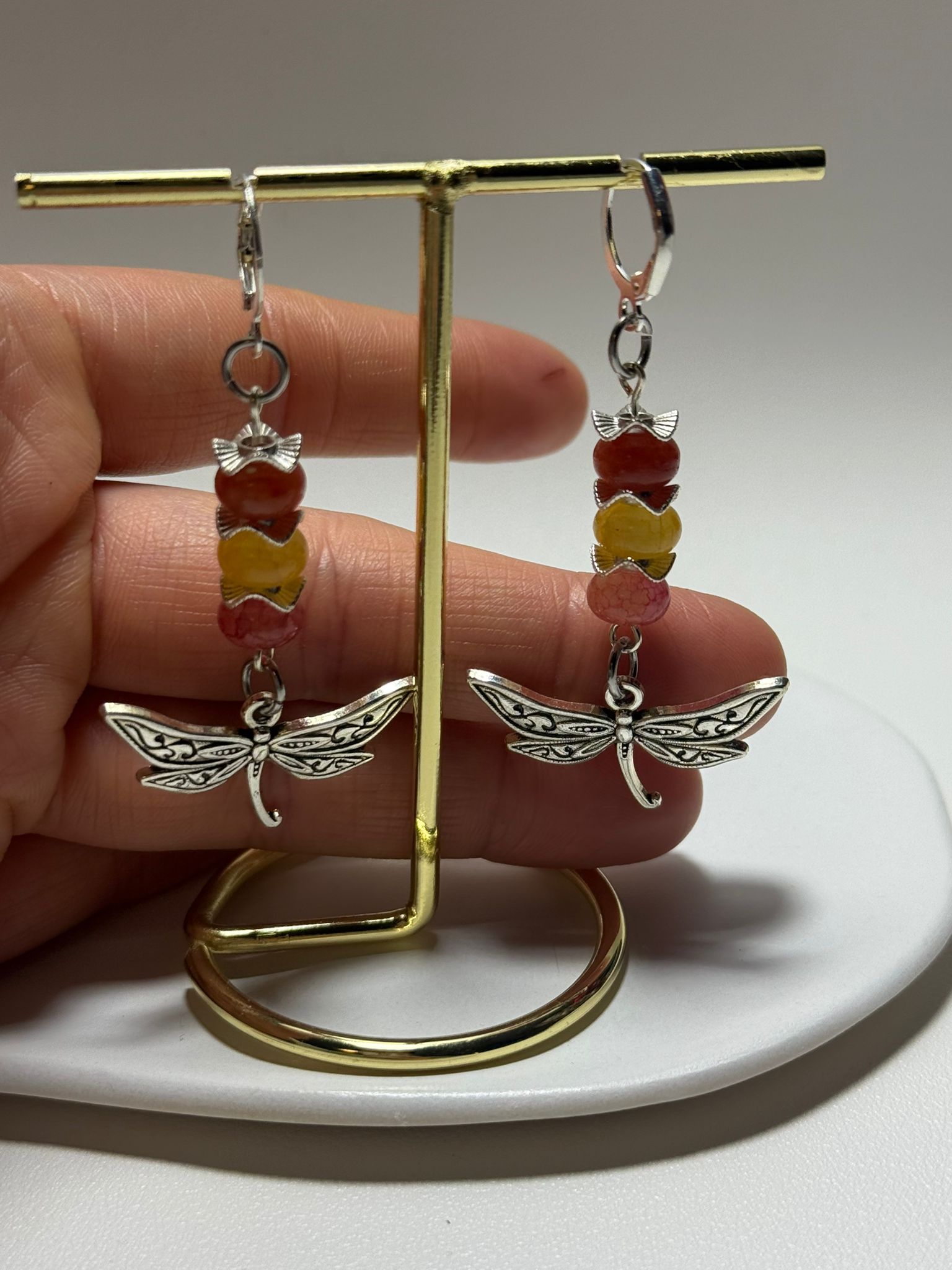 Verspielte Ohrringe mit bunten Perlen in warmen Gelb-, Rot- und Rosatönen, kombiniert mit einer filigranen Libelle. Ein echter Hingucker, der gute Laune macht und jedes Outfit aufwertet.